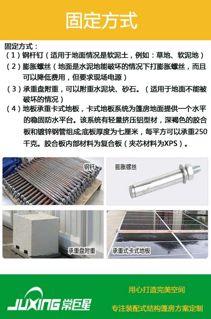 篷房安裝需要根據(jù)實際情況來定,常見的固定方式有以下幾種: